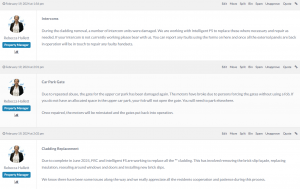 Looking familiar? Our message board looks like a forum. It’s easy to follow, has clear topics including the fire strategy, all about PEEPs, getting to know your contractors and updates on maintenance work. For now, this is for PPM to share updates with all users, however we hope to one day include discussion boards for the communities and residents. We can share events on residents behalf and will make full use of this feature.